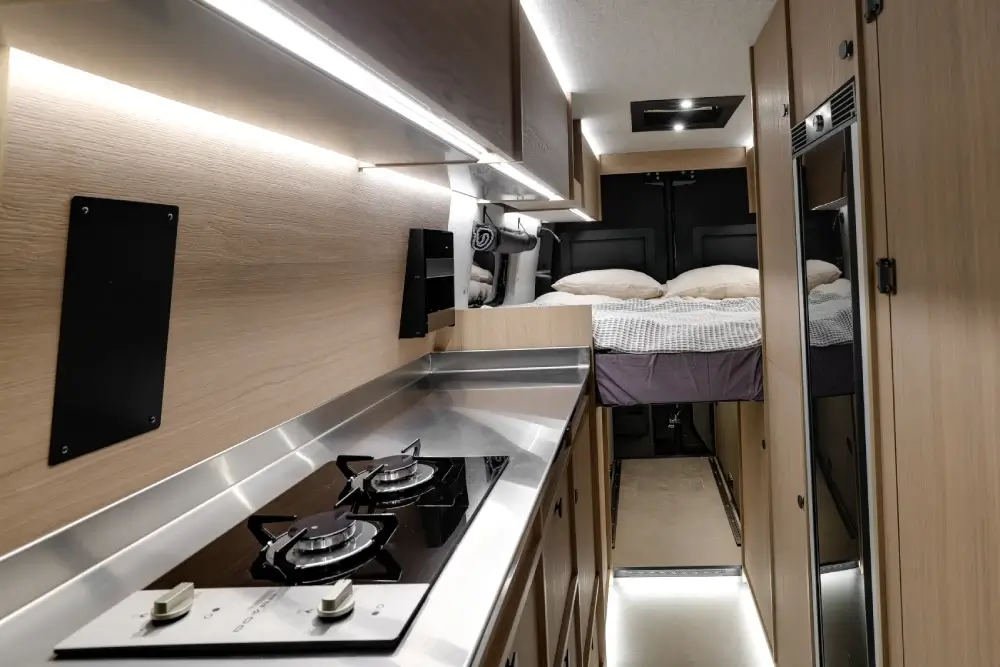 La base sobre la que trabaja Dovra es la Sprinter 319 CDI, un vehículo diseñado para repartidores, empresas de mensajería y flotas de servicio. La gracia está en que esa misma plataforma aguanta un maltrato diario brutal y que su motor 2.0 turbodiésel OM654 tiene fama de durar medio millón de kilómetros sin despeinarse, de que podrías echarle piedras en lugar de aceite y seguiría funcionando. Dovra parte de ahí y construye una furgoneta que no va a entregar cajas de cartón, sino a alojar a dos o tres personas con todas las comodidades de un piso pequeño, con la ventaja de que te puedes mover a 120 km/h por la autopista y parar a dormir en cualquier sitio.